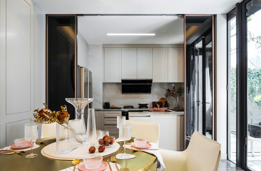 客厅、餐厅与厨房之间利用玻璃多轨移门,可以完全打开和合闭,设计师有意模糊各空间的界限,趋向于开放且多元化的居家模式。