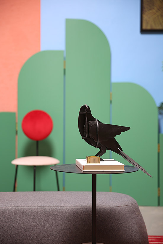 各处色彩充满了碰撞感与活力。墙上的镜画看似漫不经心胡乱切割而成,毫不规矩的边缘实为刻意之举。