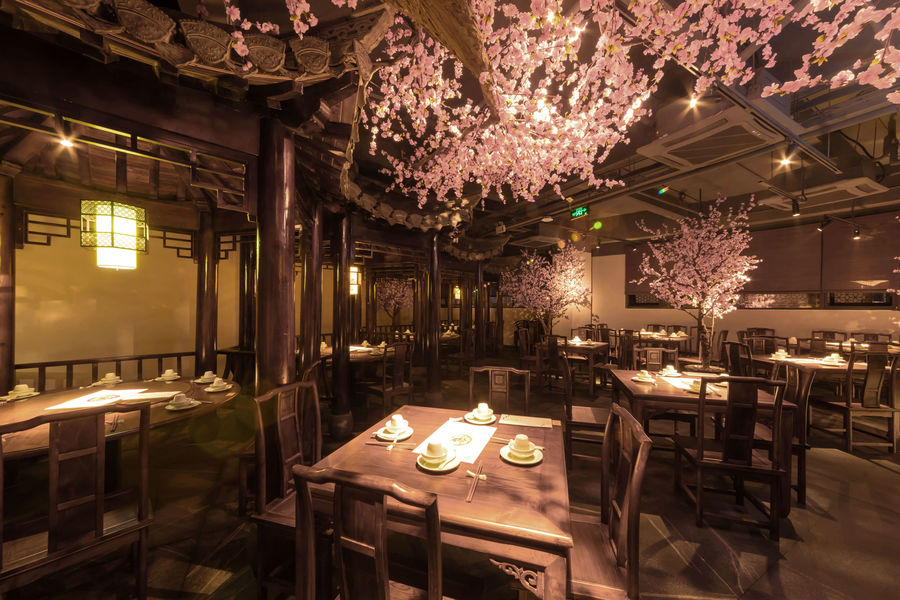 苏州园林风的窗几、墙角屋檐、木质阁楼桌椅、古典钱庄收银柜台,中国特色的灯笼……。店内菜品的特色摆盘、江浙味道,墙面的江南风光展示墙,内部江南风格的整体形象,无不展示着江南菜的品牌形象