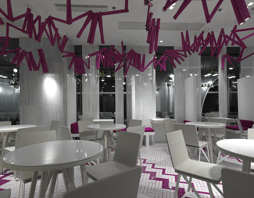 设计师描述,纵横交错、锯齿型的特制桃红色天花灯,就如把影像的像素不停放大后,可以见到的起角位,而它们相互交集,互相串连,亦表现了互联网将人与人接连在一起的特色。