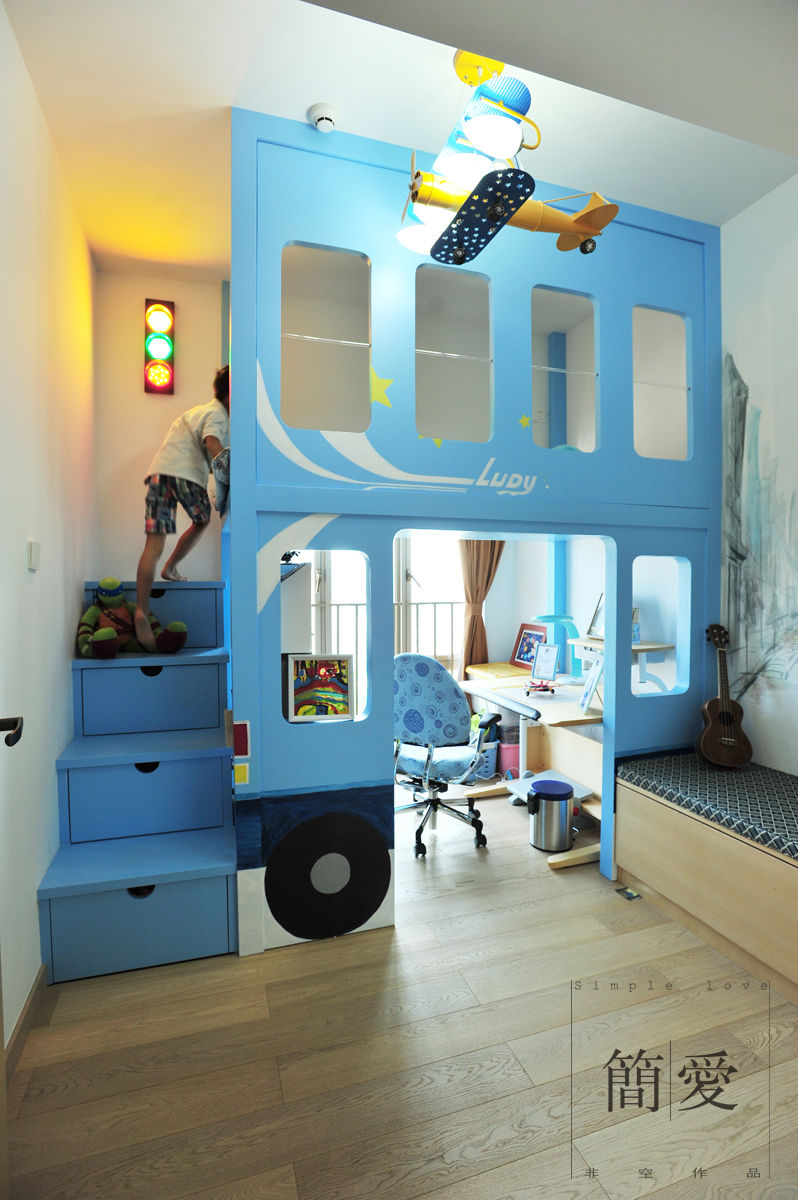 儿童房男孩LUDY的房间,正常的一间小房被“”升级“”成为复式,上层卧室,下层做书房。抽象的大巴车,飞机灯和红绿灯元素在这个屋子里任性的存在着。