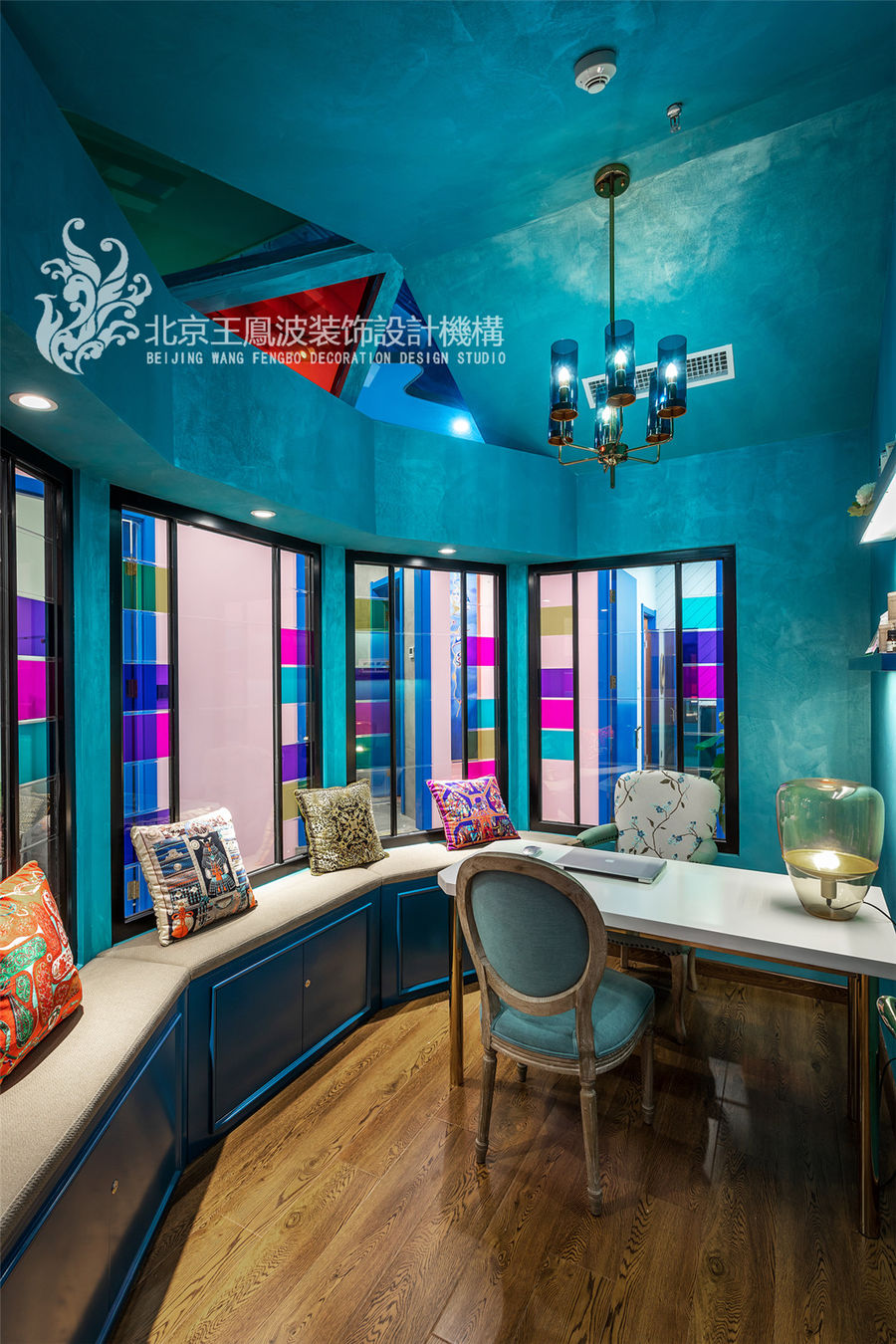 这间经理办公室则选择了蓝色中的高级色,象征着高贵和神秘的孔雀蓝,空间营造出给人特别的气氛,安静且时尚。