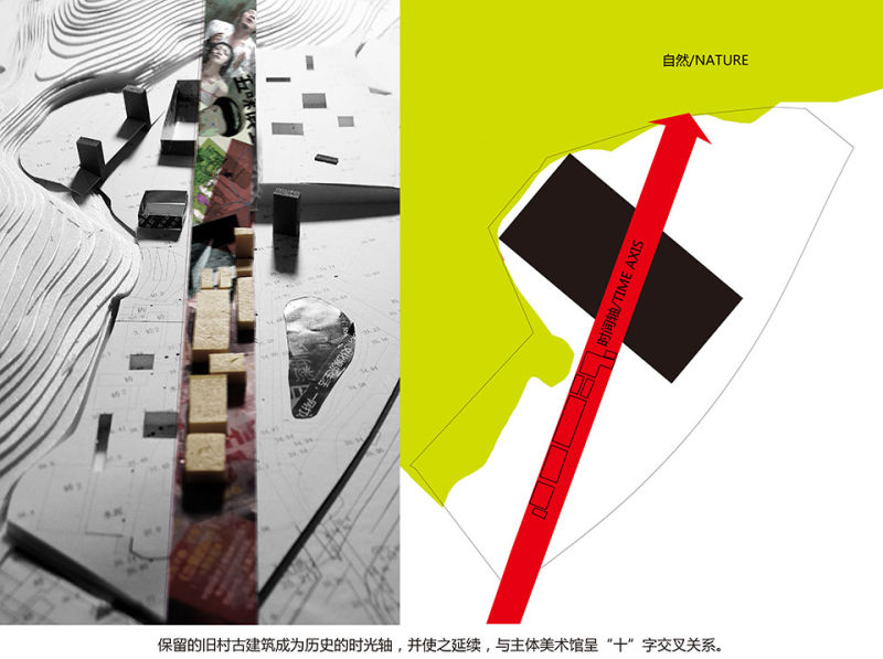 博物馆形体折起,为南方气候下的场所提供一个有阴影的覆盖,与“时光轴”垂直相交,成为一个汇集展览、工坊、咖啡厅等多种功能活动的、多元的公共开放空间博物馆主体与“时光轴”呈“十”字型关系,把场地分成四个象限,根据场地特质定义各功能属性。